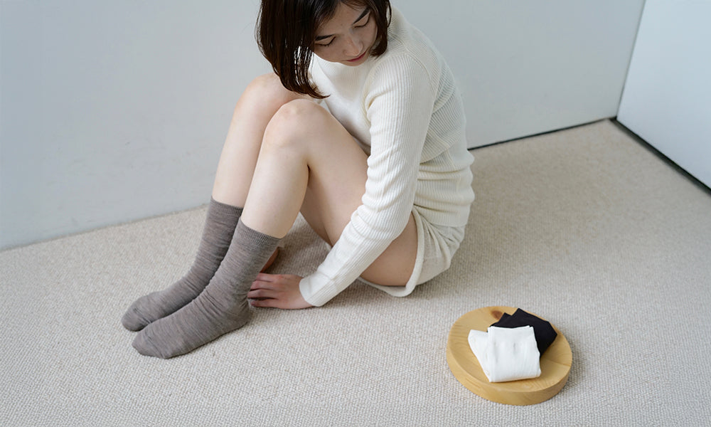 メメリの靴下は、シルク・ウール・リネン・コットンなど、からだにやさしい天然素材にこだわってつくっています。